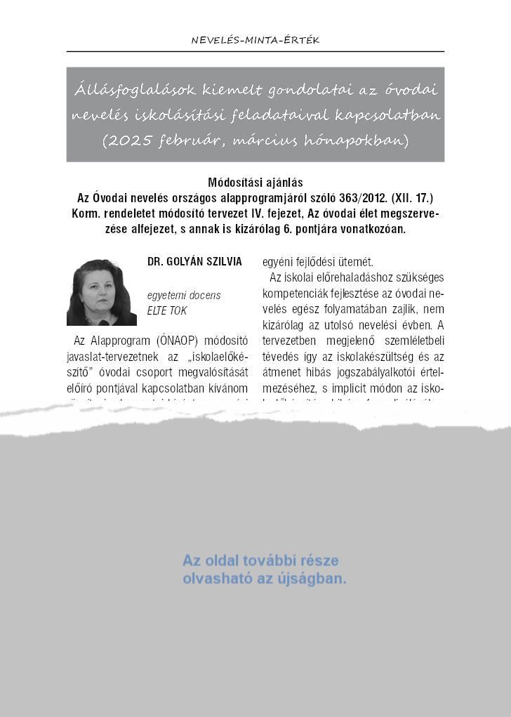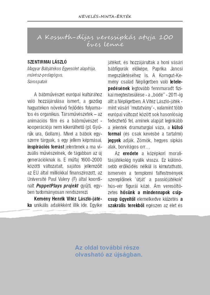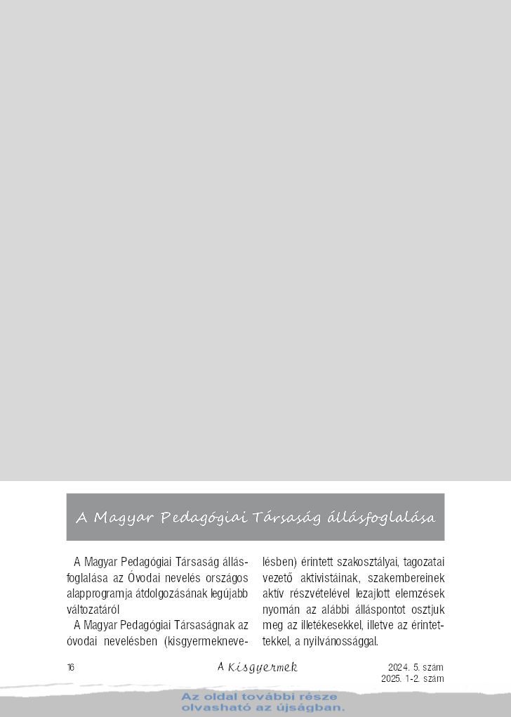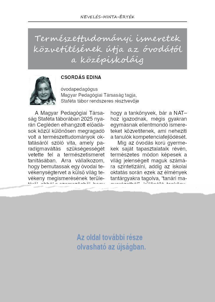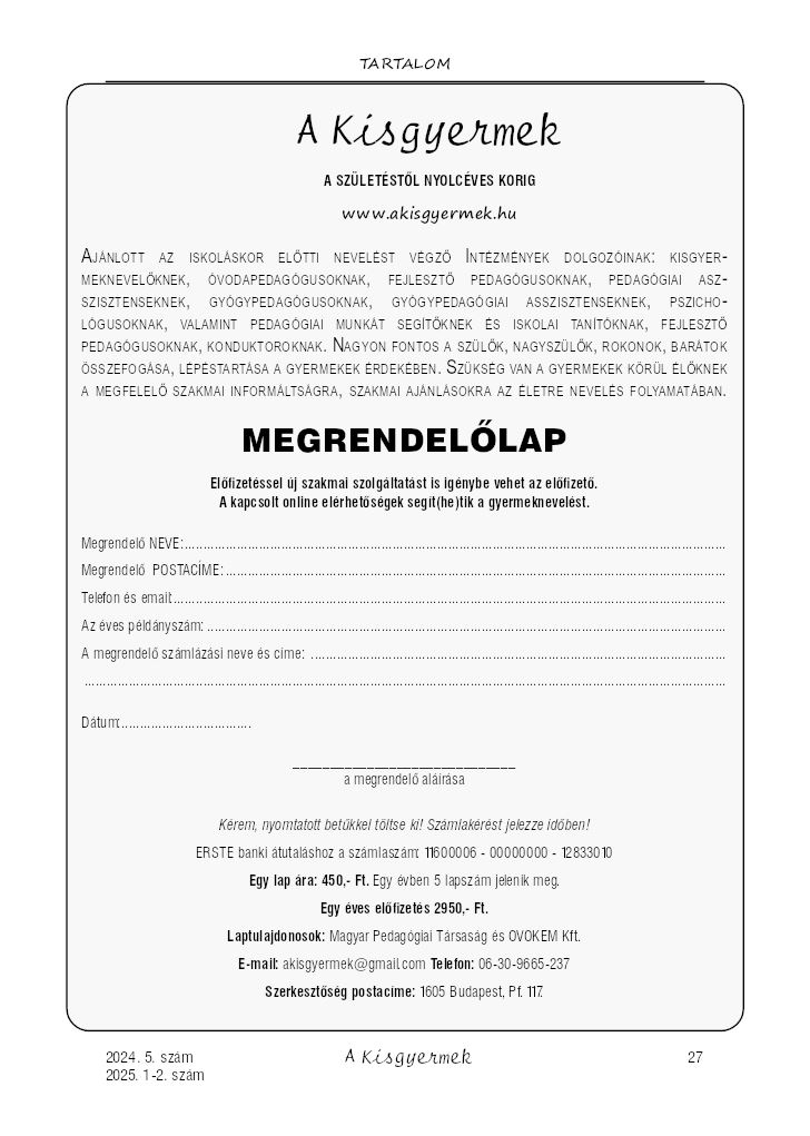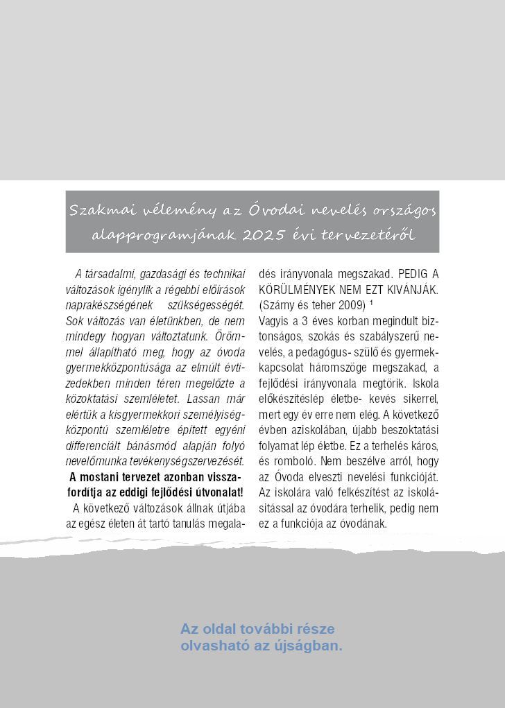 | Címlap | Belül | Zárólap | Emlékkonferencia (1./2 oldal) | Jatéktanítás (1./3 oldal) | Néphagyomány projekt | Óvoda-Iskola | Fenntarthatóság (1./3 oldal) | Tagóvoda átadó (1./3 oldal) | Rumini (1./2 oldal) | Mozgásfejlődés | Megrendelőlap | Következő lapszám | Előfizetőknek | ||||||||||