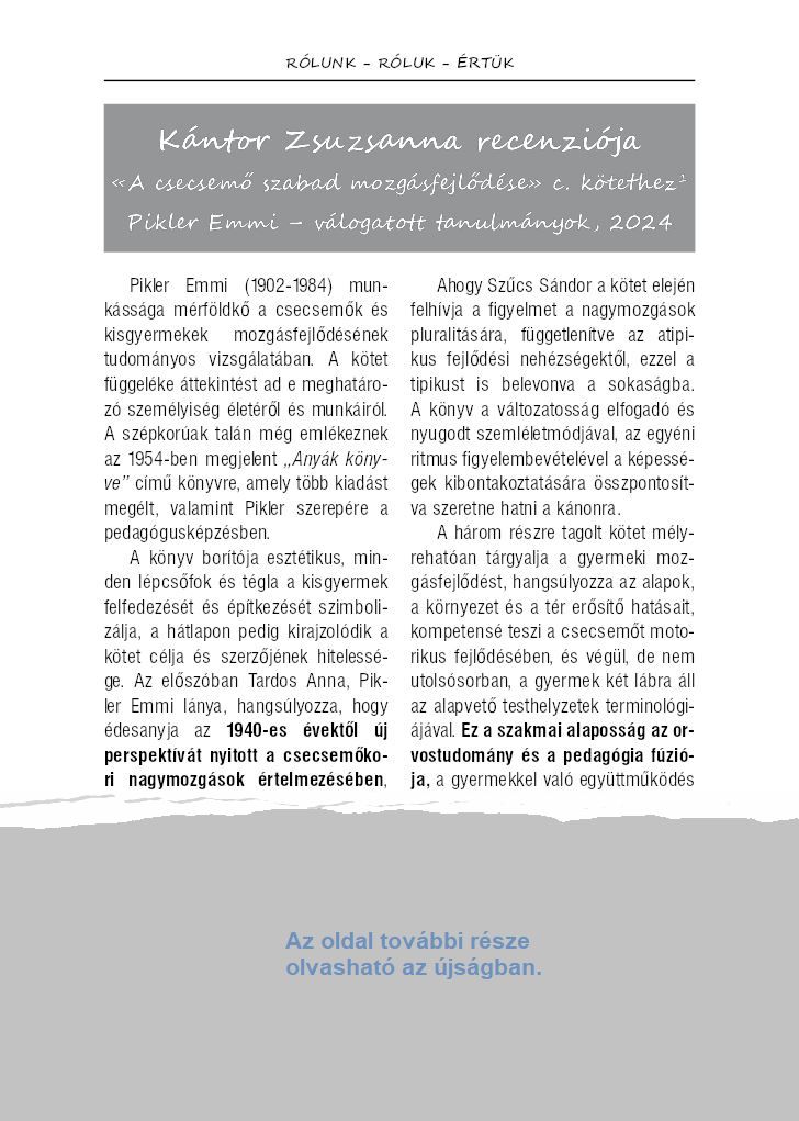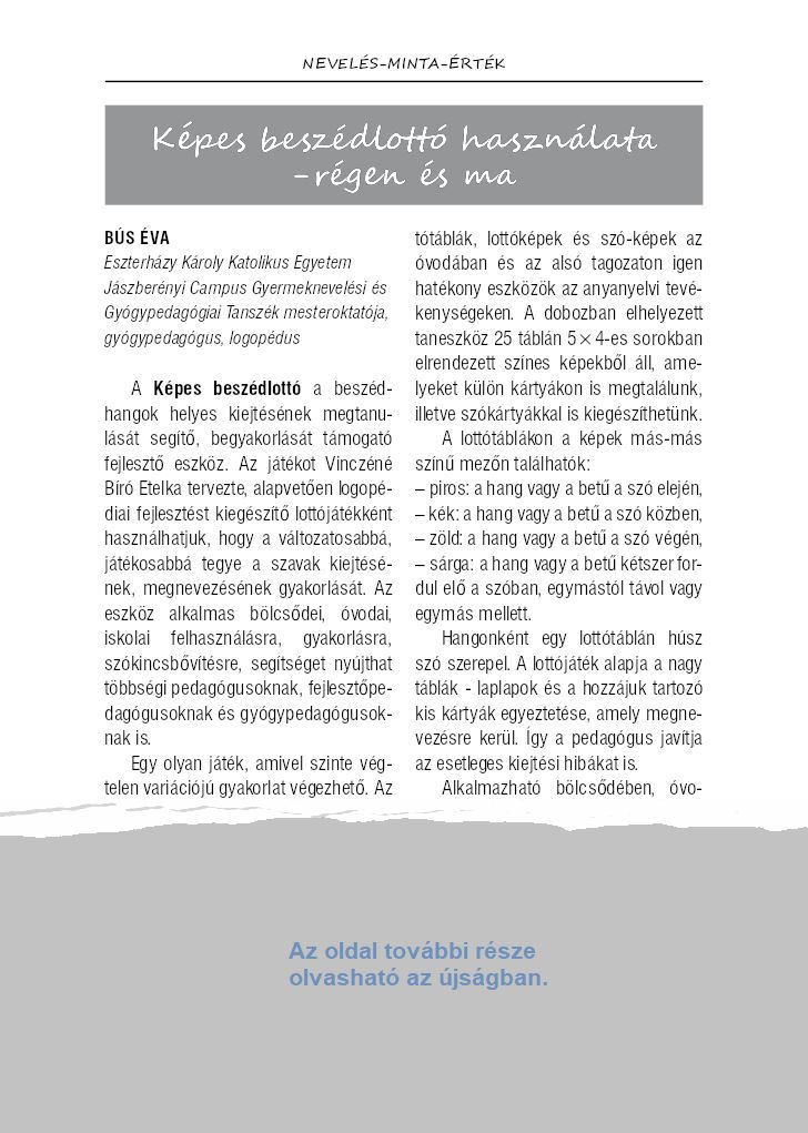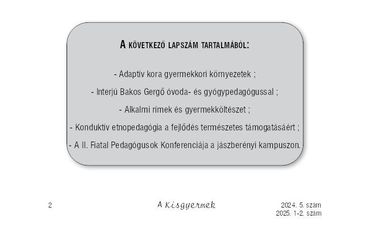 | Címlap | Belül | Zárólap | A 90 éves Tardos Anna köszöntése (1./3 oldal) | 125 éve született Celestin Freinet „leraktam egy követ, mint iránymutatót” (1./2 oldal) | Múzeum-pedagógia a Mátra Múzeumban II.rész (1./4 oldal) | Egész nap játék (részlet a könyvből) 2.rész (1./2 oldal) | Gondolkodásfejlesztés óvodáskorban: a szabálytalan játék (?!) (1./2 oldal) | Kapaszkodjunk bele bátran Kodály Zoltán pedagógiai útmutatásaiba! (1./4 oldal) | "Egészséges élet - tegyél magadért valami jót” a köznevelésben (1./3 oldal) | Tiszteletbeli tagsági cím egyik ünnepélyes átadása a Magyar Pedagógiai Társaság Kisgyermeknevelési szakosztály szervezésében (Mind a 3 oldal) | Pethő Ágnes 1949-2021 | Pillanatok egy pedagógus nagymama életéből Zenei élmények a családban | |||||||||||
