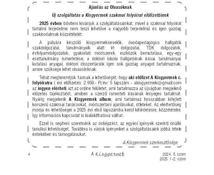 | Címlap | Belül | Zárólap | Szülők és gyermekek (1./5 oldal) | A nevelési tanácsadók fél évszádazada (1.rész) (1./6 oldal) | A mozdulat és a mozgás jelentősége a nevelésben (1./1 oldal) | Anyu meg Én (1./3 oldal) | Az óvoda iskolaelőkészítő szerepe pedagógusként szülő szemmel (1./3 oldal) | Kisfúvós zenekar sikerkörútja (1./2 oldal) | Zenés meglepetés (1./1 oldal) | Munkaköri feladataimban rejlő lehetőségek (1./4 oldal) | Távnelési feladatok lehetőségei (1./2 oldal) | Ajánlás Staféta Tábor 2020. július 2-5. (csüt.-vas.) | Mese a Dunáról (3.rész) (1./2 oldal) | Zöld Óvoda koordinátori képzésről (1./2 oldal) | Felhívás Az V. játsszunk Mindannyian! Világjátékhoz kapcsolódó országos játéknap megszervezése érdekében 2020 szept. 17-20. | ||||||||||
