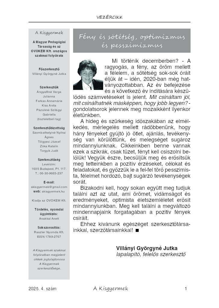 | Címlap | Belül | Zárólap | Meseterápia és robotika is segíti a hátrányos helyzetű gyerekek esélyteremtő óvodai nevelését | Népi játékok életkori metszetben (1./3 oldal) | A jóga szerepe a korai kötődés kialakításában (1./3 oldal) | Az önálló szabad játék kezdete | Játéknapi események 2020-ban (1./4 oldal) | A mi fejlesztő szobánk csodái (1./2 oldal) | A kisgyermeknevelők lelki egészsége ebben a járványügyi helyzetben (1./5 oldal) | Mit tegyek...? (1./3 oldal) | Búcsú Pereszlényi Évától (1./2 oldal) | Pedagógus nagymama (2.rész) (1./2 oldal) | Az eleven emlékmű csoport tanévnyitó beszélgetésén hallottuk (1./3 oldal) | |||||||||